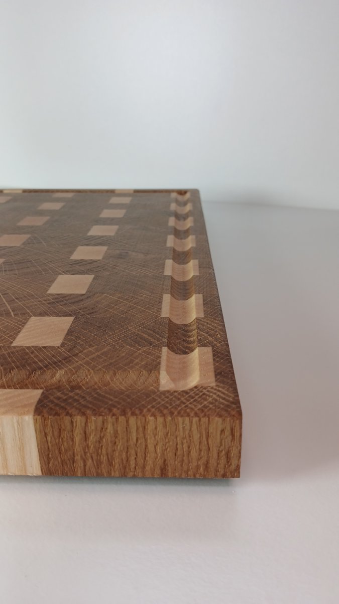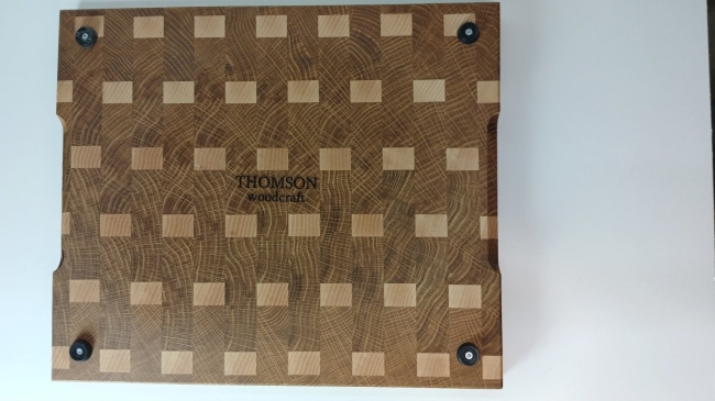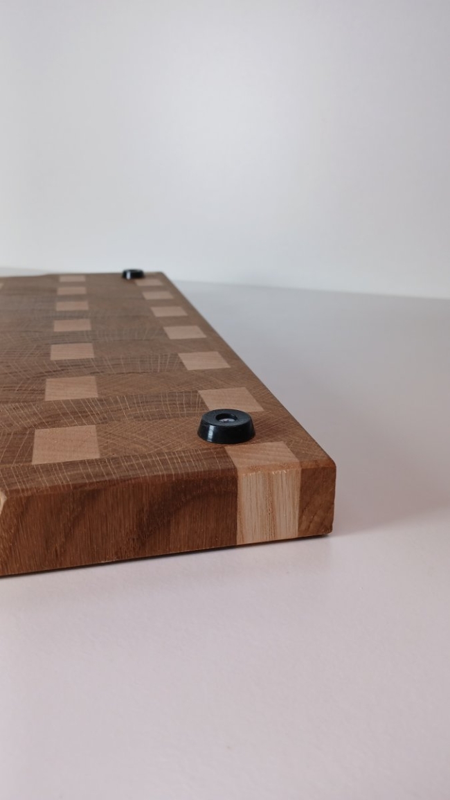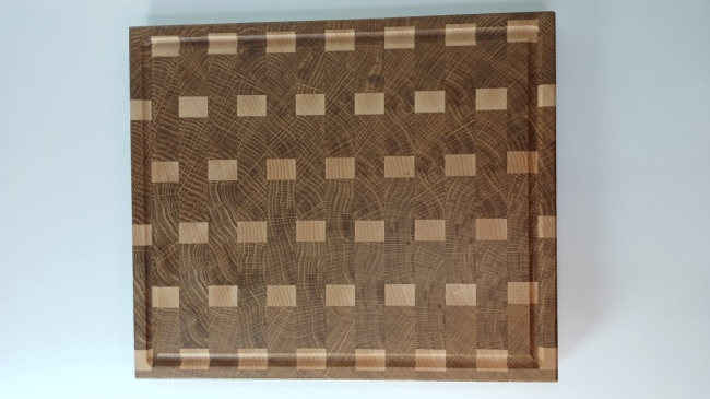 Cette plache en chêne et frêne reprend la technique des billot de boucher, le file du bois est debout et non couché.